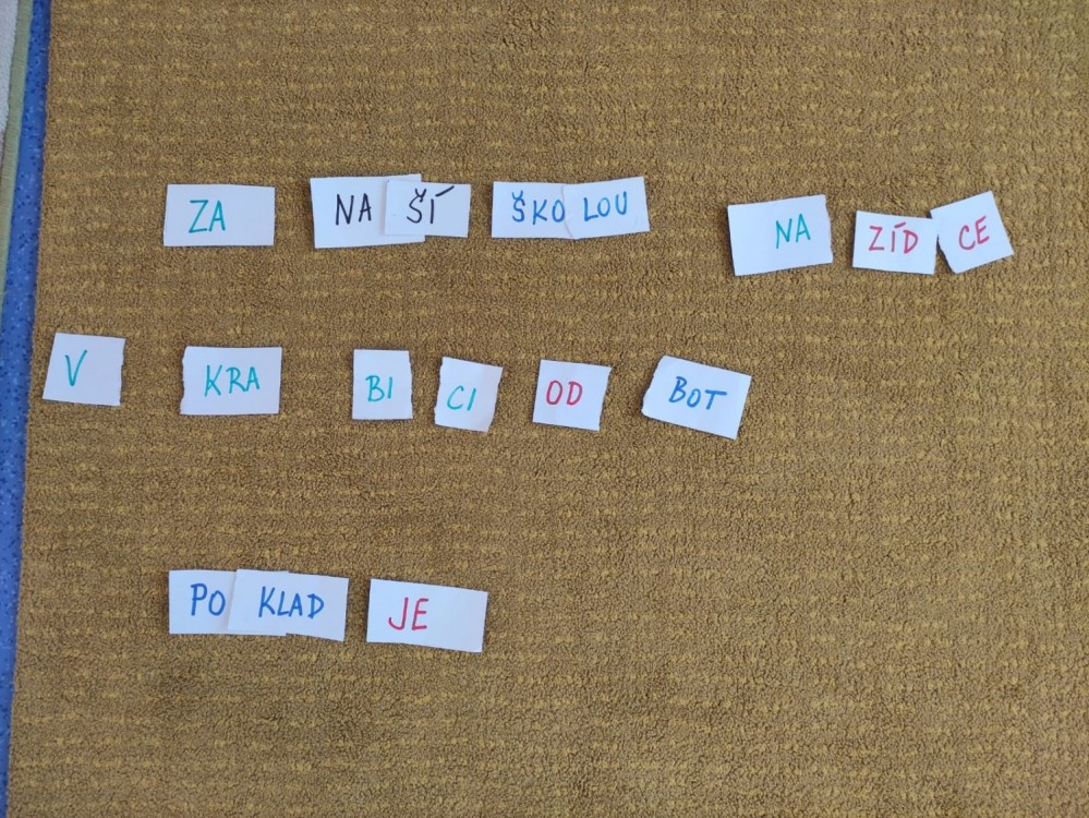 V naší třídě jsme nezapomněli ani na Den dětí. Abychom si ho pořádně užili, začali jsme venkovní aktivitou, kde si děti musely zapamatovat obrázek a zapisovat  část, která chybí. Šly sami ve dvojicích a v cíli si obrázky a zapsaná slova zkontrolovaly. Všichni první úkol zvládli výborně. Potřebovali ale splnit ještě další 3, aby získali indicii k pokladu. To vše se také podařilo. ALE největší práce nás teprve čekala - domluvit se a poskládat nápovědu, kde je poklad schovaný . Tam se děti pěkně zapotily! Nakonec se ukázalo, že dohadování nikam nevede. Spolupráce byla lepší volba  a poklad byl nakonec nalezen :-)
