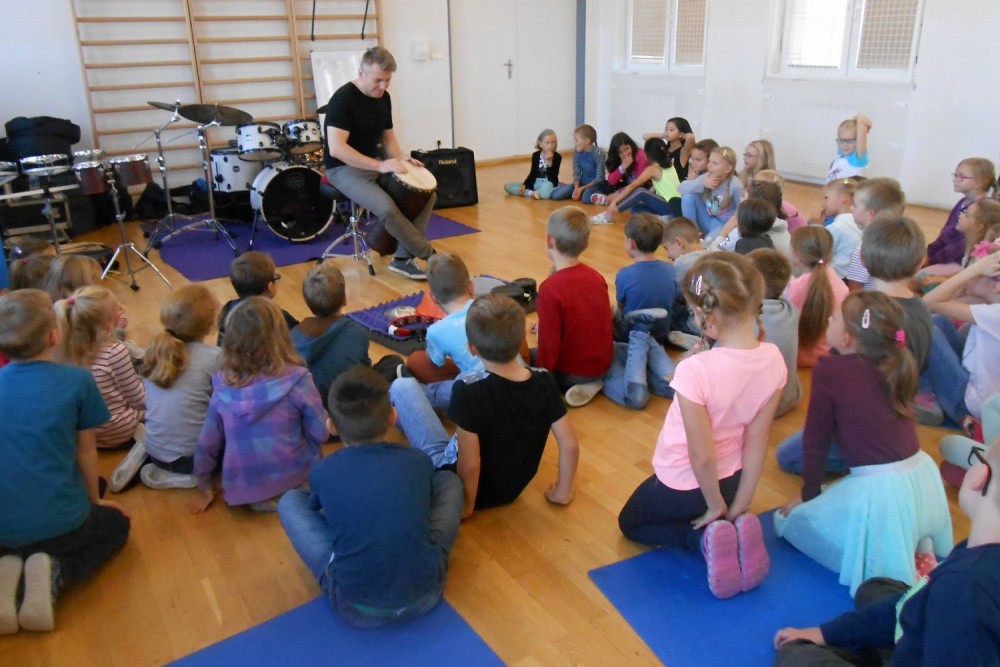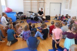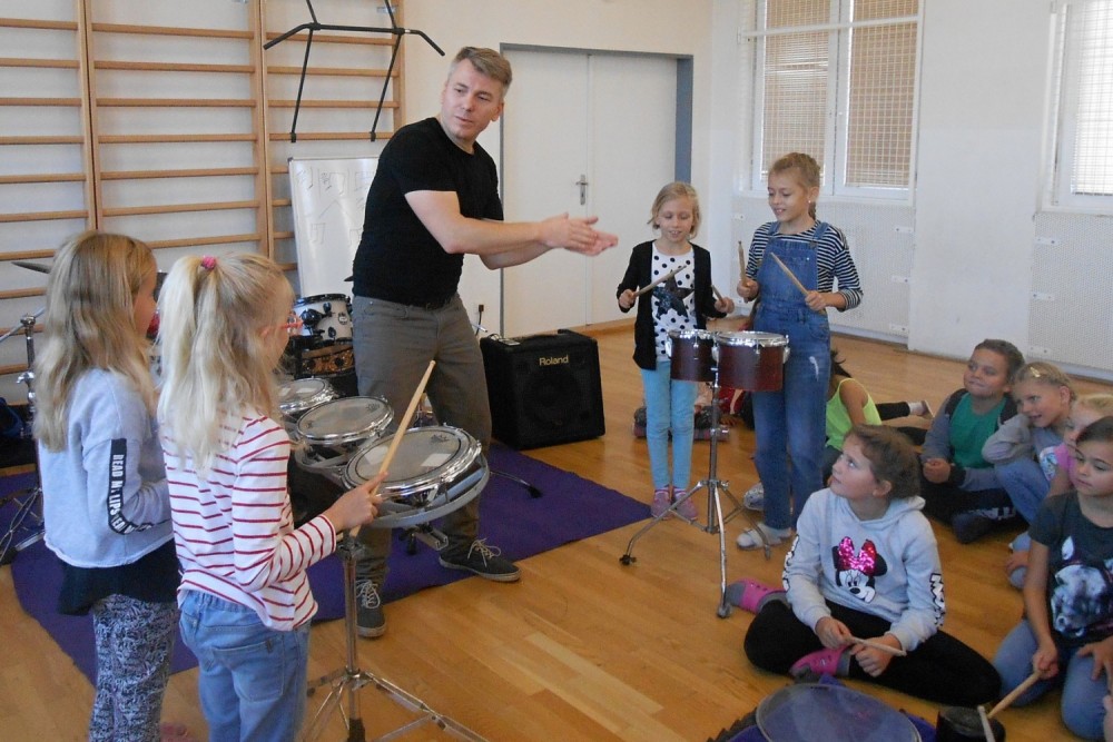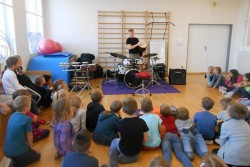 V programu "Škola rytmu s Pavlem Břízou" jsme si vyzkoušeli, jestli by z nás byli dobří bubeníci. Kromě bubnů a bubínků jsme si zahráli na staré kastroly a další předměty. Také jsme si zopakovali něco o notách a na závěr se rozhýbali a zahráli na vlastní tělo.