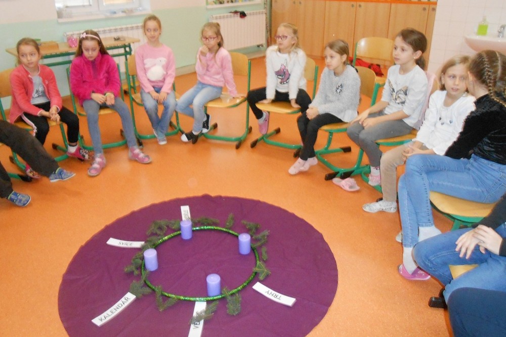 V pondělí hned po první adventní neděli jsme si ve výukovém programu "Vánoce" povídali s paní Klangovou o všem, co souvisí s adventním časem a poslechli jsme si také příběhy z historie o Mikulášovi, Barboře a Lucii a o tradicích, které se udržují ve spojení s nimi až do dneška. Vytvořili jsme si symbolický adventní věnec.