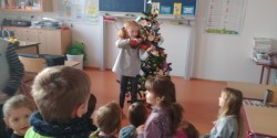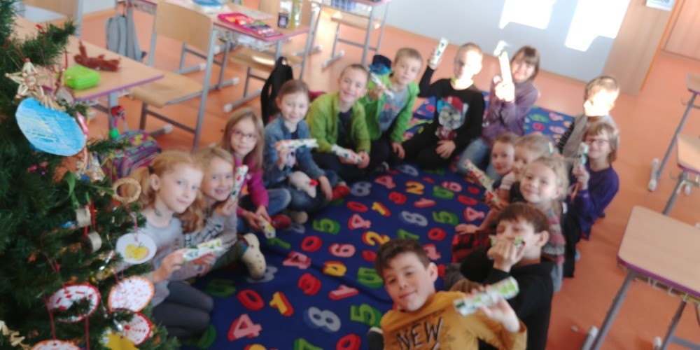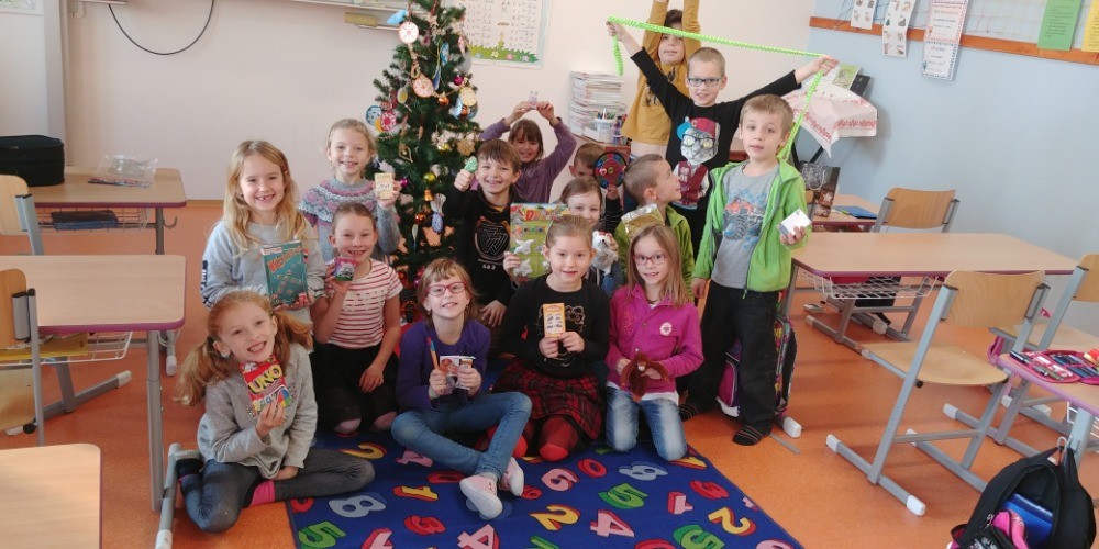 Na dnešní den jsme se všichni už dlouho těšili! Ráno jsme se sešli ve třídě, každý si mohl sednout se svým kamarádem, vytáhli jsme místo učebnic cukroví a užívali si. Nejprve nám Tonička zahrála krásně na housle, potom jsme si připravili koberec a stromeček. Do klobouku jsme dali lístečky se jmény, pod stromeček přinesené dárečky a vánoční tombola mohla začít. Po rozdání přinesených dárečků nám zbylo i trochu času, abychom si s nimi pohráli. Druhou půlku výuky jsme strávili na vedlejší budově, kde si pro nás starší spolužáci přopravili krásné divadelní představení - Anděl páně. Na závěr nechybělo zpívání koled pod taktovkou paní učitelky Podracké. Děkujeme všem a zdravíme i naše nemocné spolužáky!
