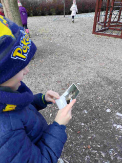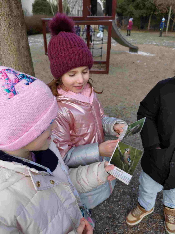 Při výtvarné výchově se druháci šli osvěžit na čerstvý mrazivý vzduch. První pohled padl na bílou trávu. Je to led? Sníh? ... Už víme, jinovatka! A na stole je námraza! Kreslení šlo samo až do té doby, než se ozval zpěv našich stálých ptáků. Žáci je našli a namalovali.