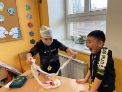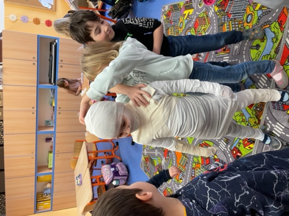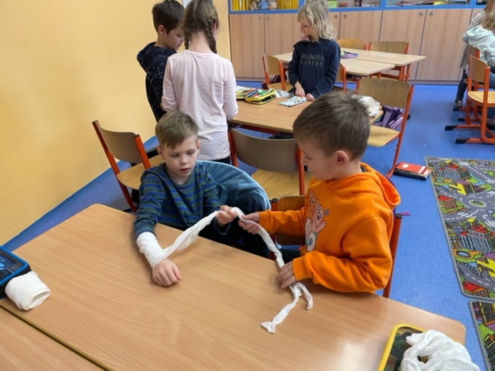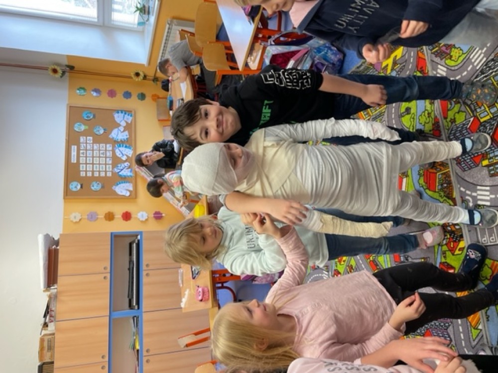 6. 2. 2023 Po hodině první pomoci už určitě děti naší třídy menší zranění nerozhází... Prakticky si vyzkoušely, jak obvázat ránu a na konci hodiny jsme měli ve třídě živou mumii:-)... 24 / 2 / 2023 EN