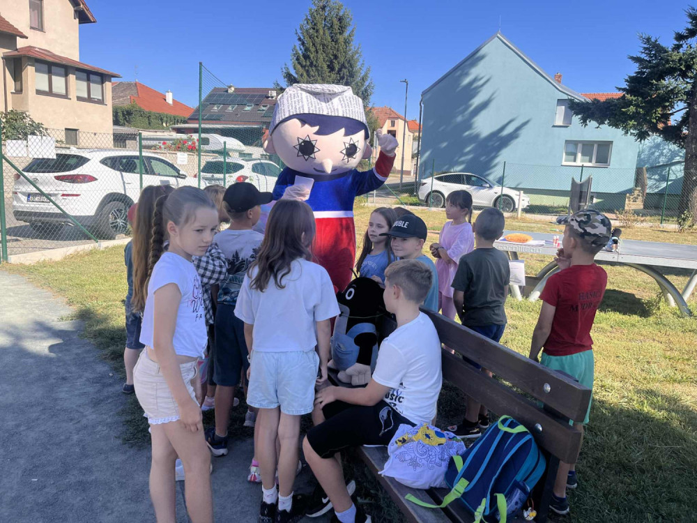 První školní týden už je skoro za námi a my jsme si ho zpestřili venkovní aktivitou. Na hřišti nás přivítal sám Večerníček, protože právě slaví 60. narozeniny :-). Po splnění 10 úkolů na stanovištích jsme si ještě procvičili paměť hraním večerníčkového pexesa a doubla. Za odměnu jsme každý od Večerníčka získali drobné dárečky. DĚKUJEME!