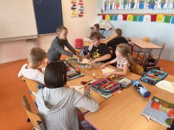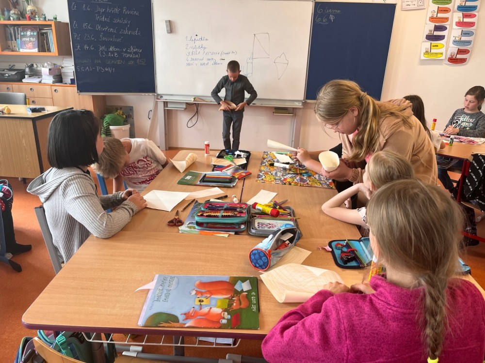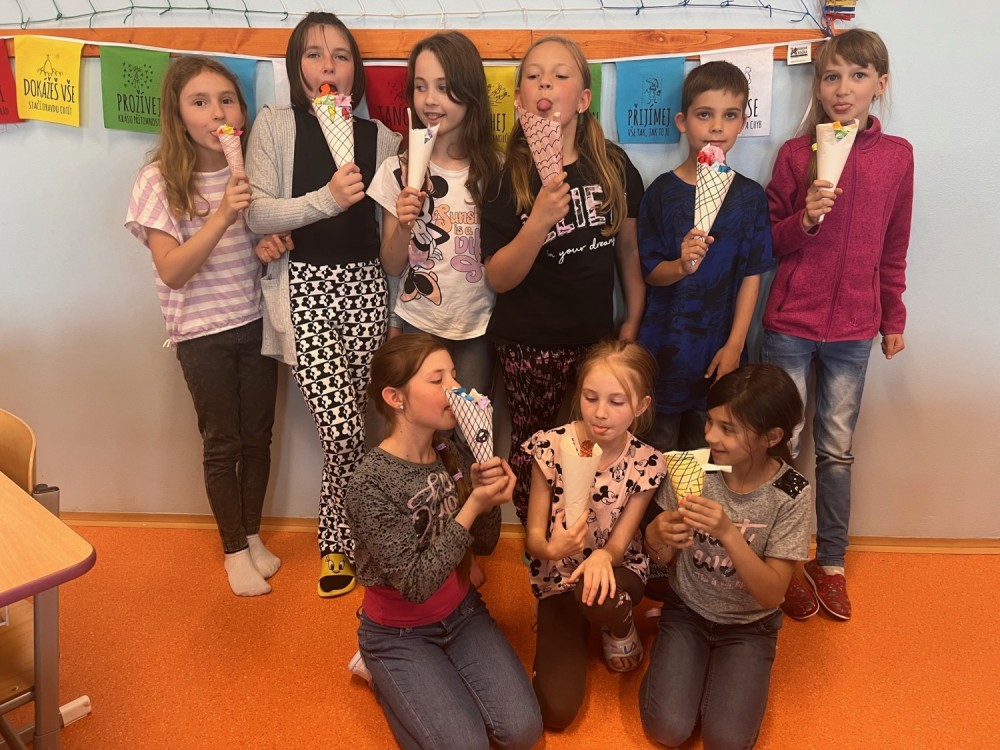 Dnes jsme si v pracovních činnostech vyměnili roli - z Mildy se stal pan učitel. Doma si připravil výrobek, před hodinou sepsal na tabuli pro ostatní spolužáky pomůcky, které si nachystali. Všichni si nejprve vyrobili kornoutek s různým vzorem, který potom naplnili různými druhy zmrzlin. Někteří nezapomněli ani na křupavý oplatek :-).
