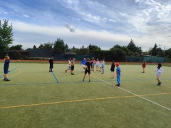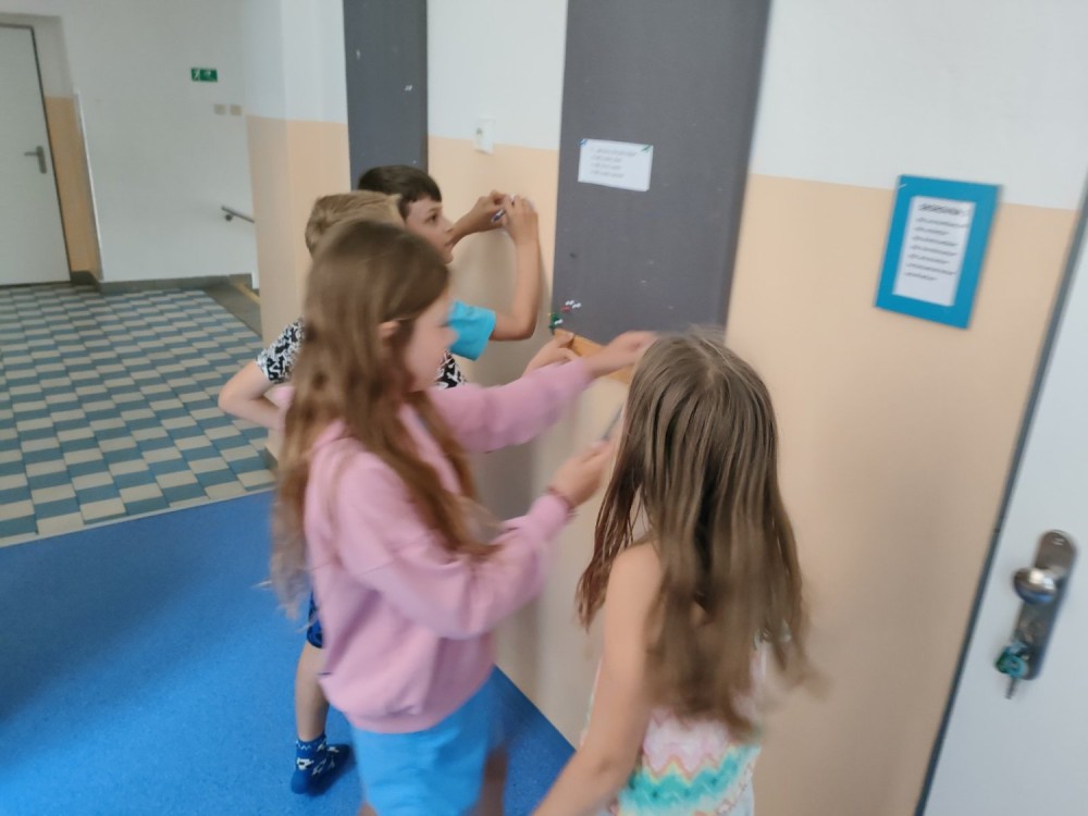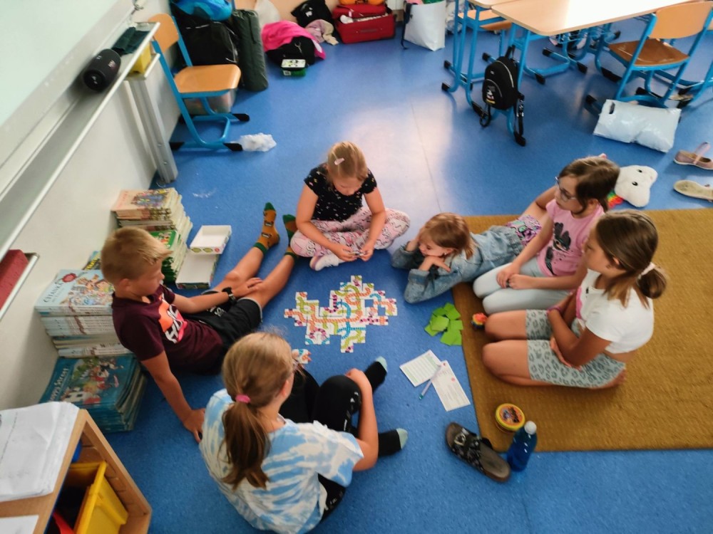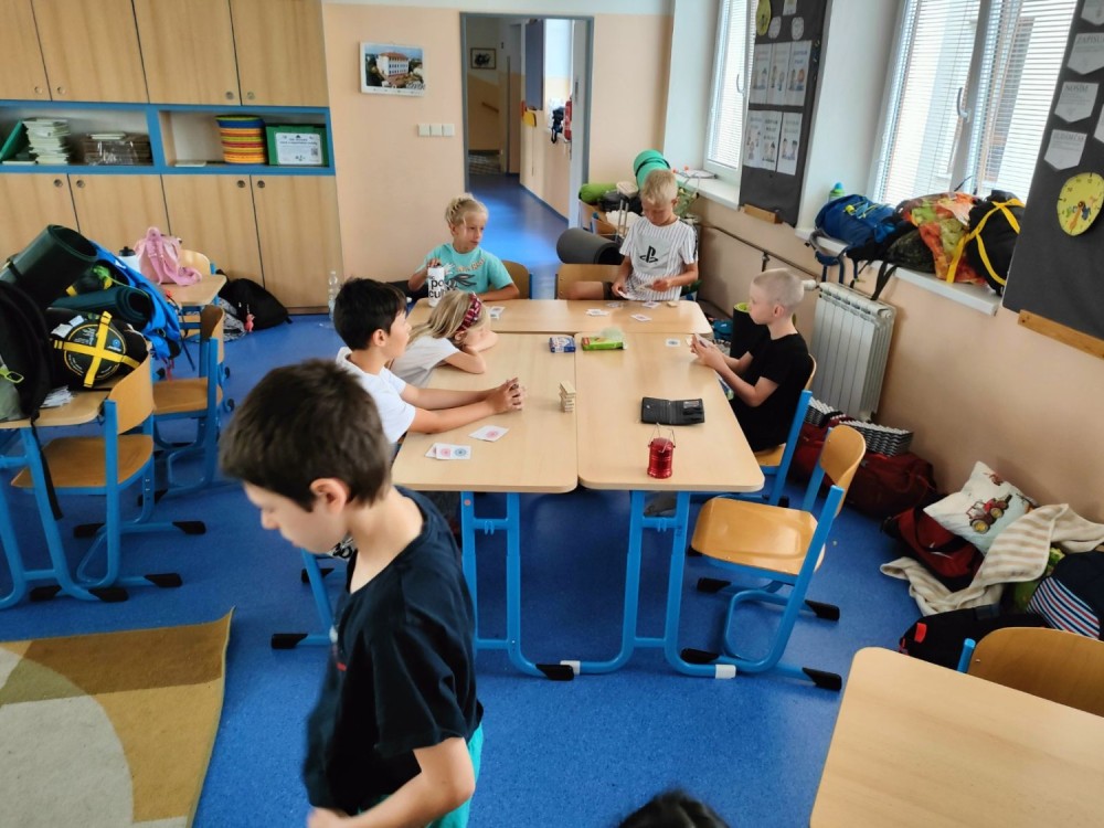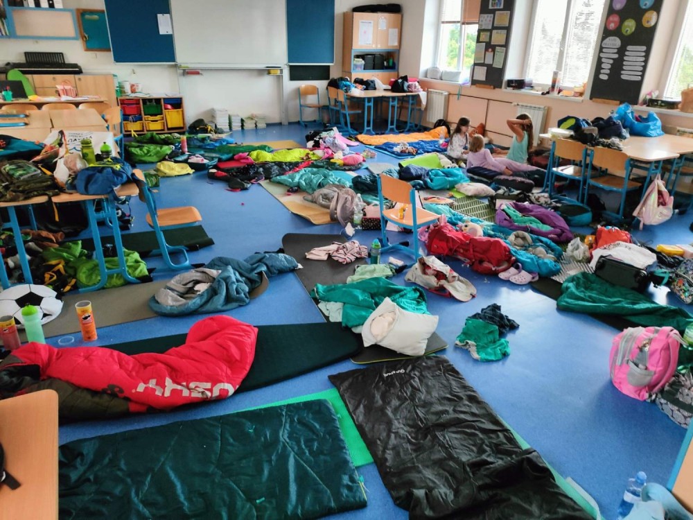 Na závěr školního roku jsme si program zpříjemnili spaním ve škole. Sraz byl v 17:30, kdy jsme se sešli vybavení věcmi na party i spaní. Jako vždy nesměl chybět fotbal venku. Po večeři jsme hledali poklad po škole, povídali si, hráli, vyráběli trička a sledovali pohádku na dobrou noc. Všichni už byli zkušení "spáči" ve své třídě. Kluci také bezvadně pomáhali vytahat holčičí kufry do 2. patra. Moc je za to chválím a děkuji! :-)
