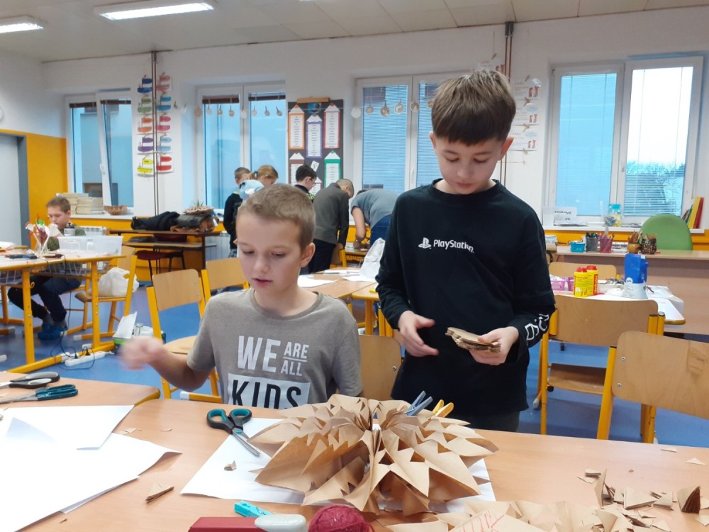 Prožili jsme velmi inspirativní projektový den. O náplň letošních dílniček se velkou měrou postaraly naše maminky a některé nás v pátek navštívily, aby nám pomáhaly vyrábět vánoční dárky. V pondělním diskuzním kroužku jsme se shodli, že dílničky byly "mega super".
