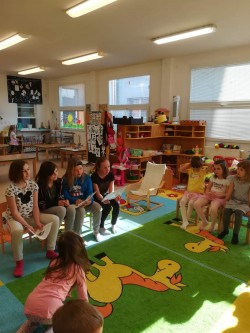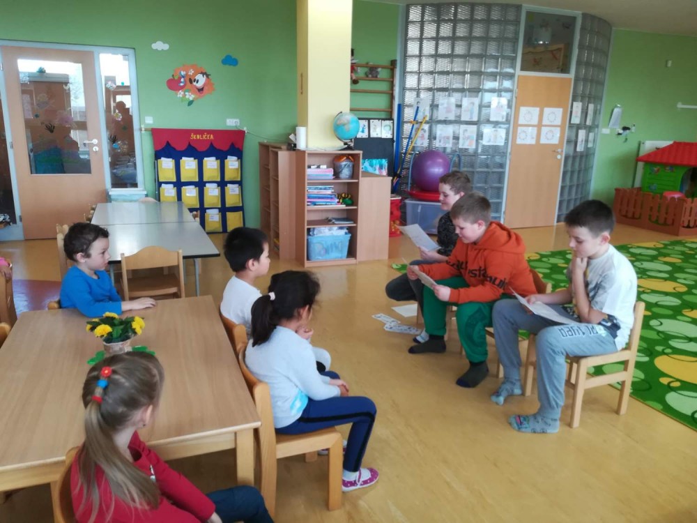 Během měsíců února, března a dubna jsme se účastnili projektu Mateřské školy v Modřicích, kdy jsme navštívili tuto MŠ,abychom předčítali dětem oblíbené pohádky a pověsti. Na návštěvy jsme se s naší paní učitelkou poctivě připravovali a to nejen ve výrazném přednesu, ale také jsme si nachystali pro děti ilustrační obrázky k vymalovávání. Na posledním předčítání jsme děti učili i říkanku - písničku s doprovoden hry na tělo. Dětem se to moc líbilo a i my jsme měli příjemný pocit.