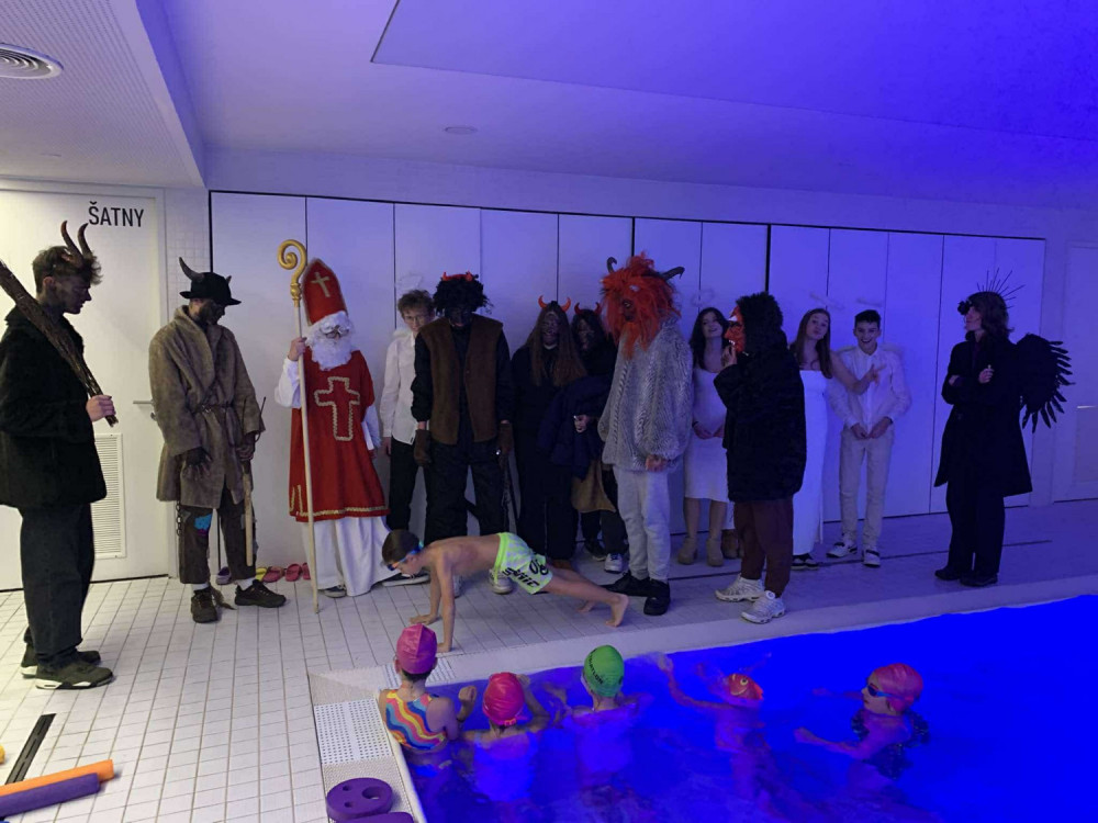 6. 12. 2024 V hodině plavání nás překvapil Mikuláš se svojí družinou čertů a andělů. Některé děti se přiznaly k drobným prohřeškům a za trest si udělaly pár kliků nebo byly hozeny do bazénu. L.Š. 16 / 12 / 2024 LS