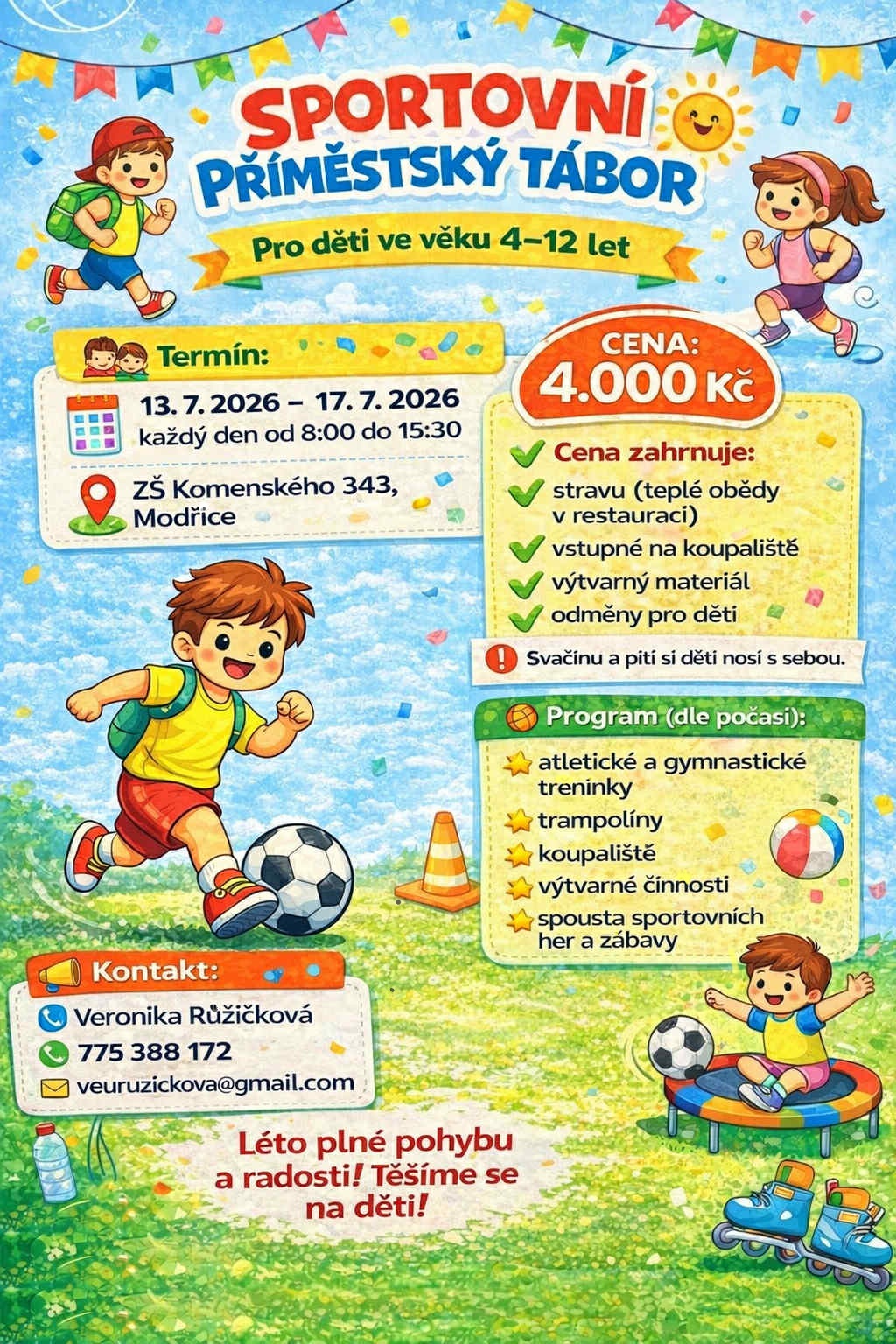 SPORTOVNÍ PŘÍMĚSTSKÝ TÁBOR pro děti od 4 - 12 let 13. - 17. 7. 2026, ZŠ Komenského 343, Modřice Veronika Růžičková, tel: 775 388 173, veuruzickova@gmail.com 4 / 2 / 2026 KV