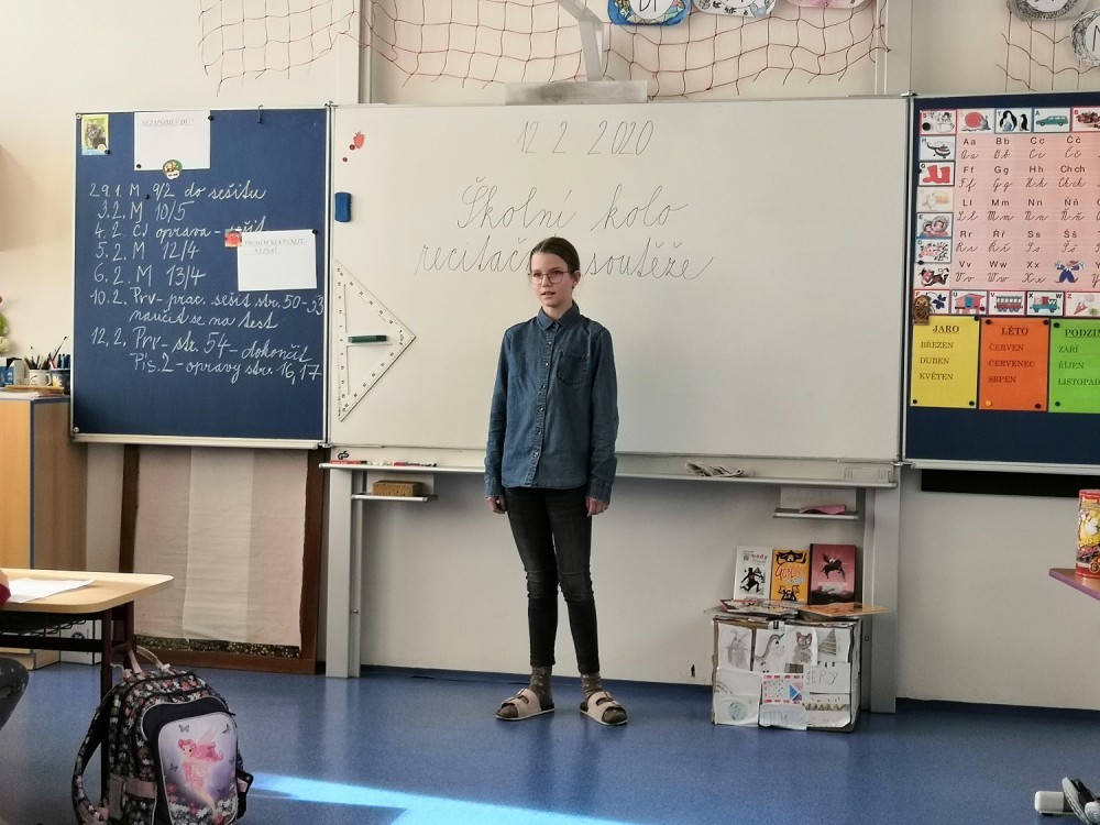 V hodinách českého jazyka často přednášíme básně a při této příležitosti se ukazuje, kdo z nás má k recitaci vlohy a koho poezie baví a nedělá mu potíže. Do recitační soutěže, která se konala na naší škole ve středu 12. února, byly nominovány i žákyně naší třídy Markéta Klangová a Eva Gajdušková. Obě dívky se básně, s jejichž výběrem jim pomohla paní učitelka třídní, poctivě naučily a také ve třídě několikrát zarecitovaly. Jejich námaha byla zúročena, Markéta Klangová se umístila ve velké konkurenci na krásném 2.místě. K jejímu úspěchu ji srdečně gratulujeme. A i když víme, že se nemohou na předních místech umístit všichni, moc si vážíme a děkujeme za účast a odvahu všem ostatním účinkujícím recitátorům.