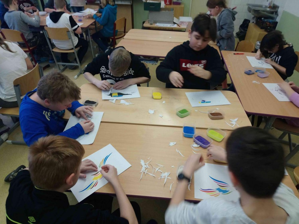 Jenoduchý návod jsme ihned všichni zručně zvládli a začali tvořit krásné, barevné kombinace. Na konci hodiny jsme byli v záplavě pestrobarevných aut, čápů, papoušků i slonů. Některá vznikající umělecká díla si můžete prohlédnout v galerii pod příspěvkem.