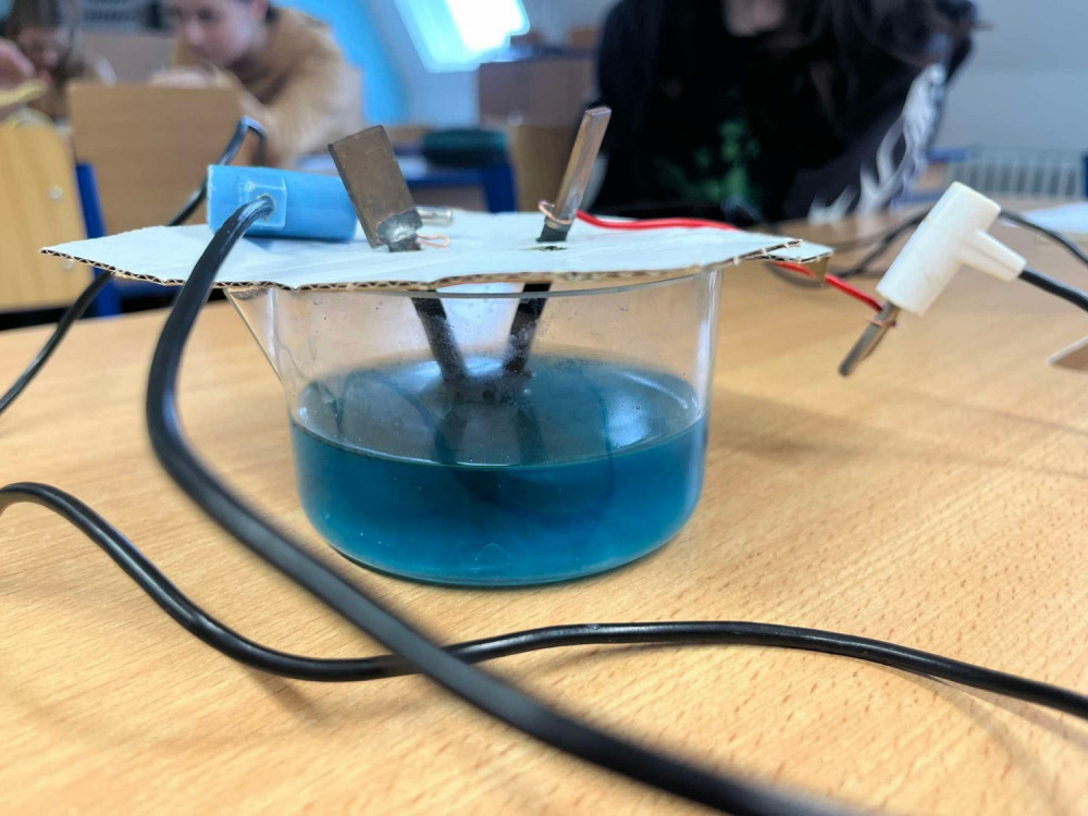 Nejprve jsme se zaměřili na elektrolýzu, během které žáci sledovali rozklad látek pomocí elektrického proudu. Díky tomuto pokusu si mohli na vlastní oči ověřit princip tohoto procesu a jeho využití v průmyslové praxi.