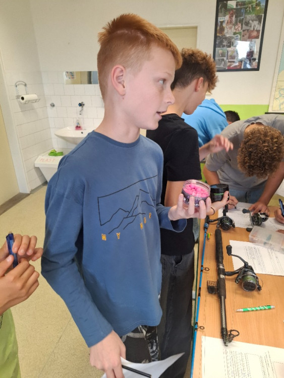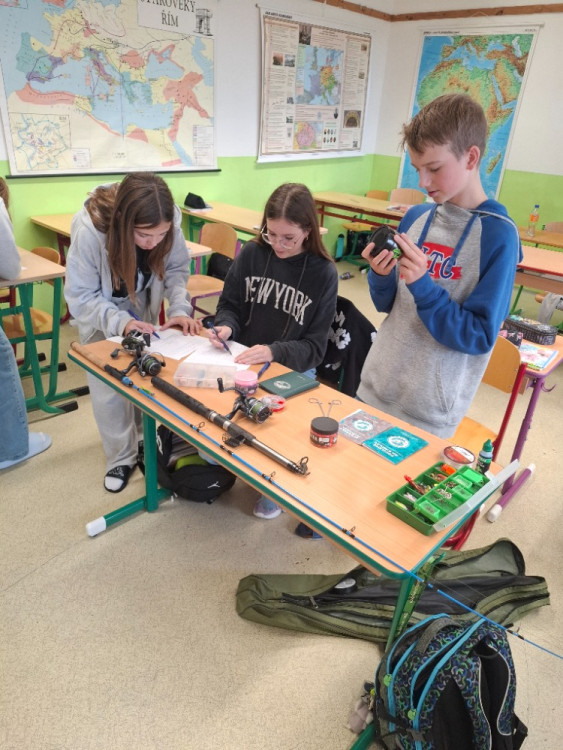 – přinesli do školy své vybavení: pruty, navijáky, návnady, podběráky i různé druhy nástrah. Vznikla tak malá výstava, kde si každý mohl pomůcky prohlédnout zblízka, osahat si je a zjistit, jak se používají v praxi.