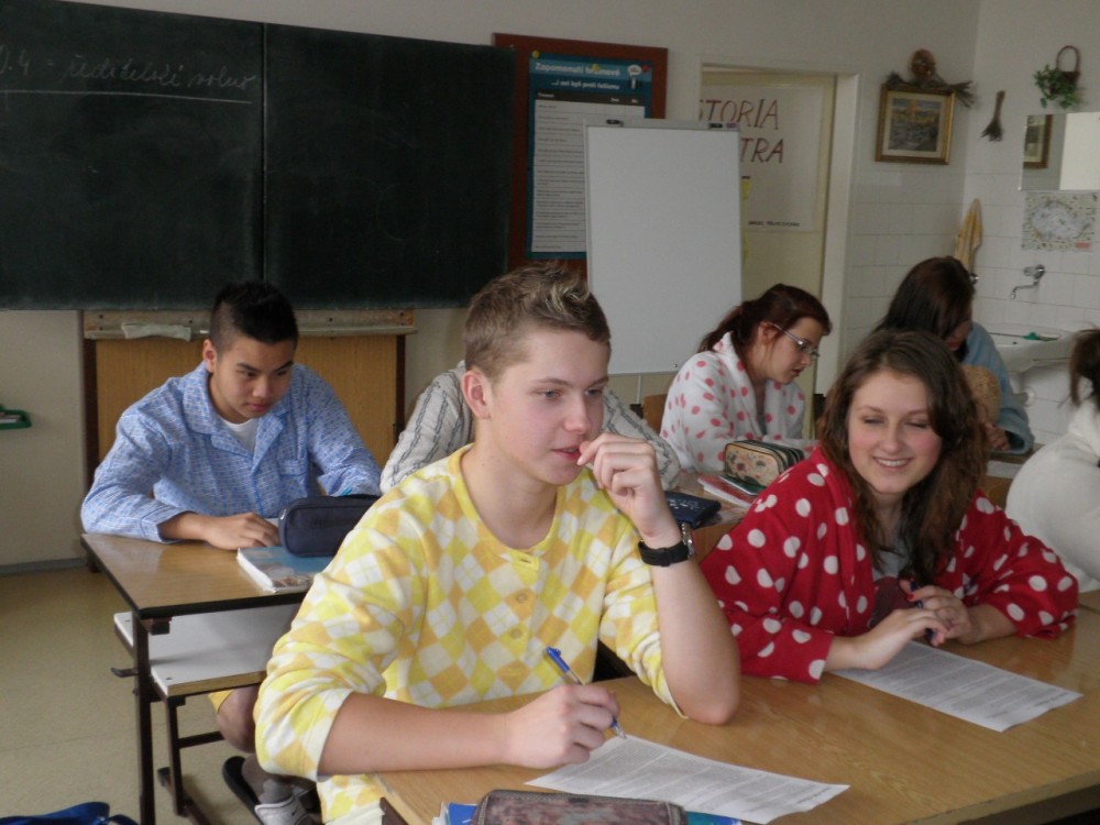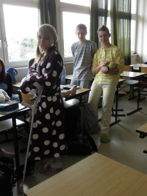 Apríl jsme začali zvesela, i když nás v tomto měsíci čekají zkoušky na střední školy. Nebo právě proto, veselá mysl je půl zdraví, jak říká jedno přísloví. A recese a humor jsou nám vlastní, proto jsme se všichni velmi dobře bavili. Zvlášť vydařené pyžámko měl Ondra Zítka a Tomáš Le, děvčata byla cudně zahalena ve slušivých župáncích. Uvolněný oděv navozoval uvolněnou a milou náladu. Do konce školního roku nám zbývají jen tři měsíce, jen tři měsíce budeme spolu v této škole. Proto si to chceme pořádně užít. Veselý april Vám přejí všichni z IX. třídy.