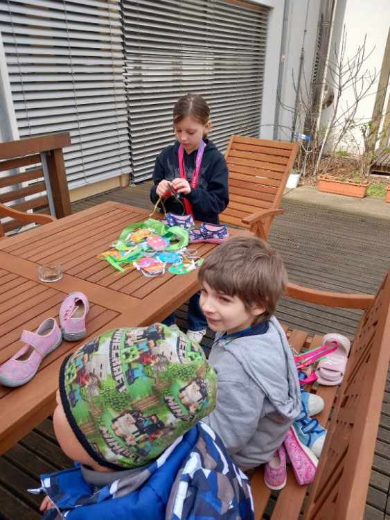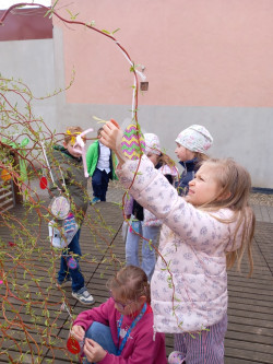 Stejně jako vloni jsme ozdobili barevnými vajíčky větve vrbičky u Pasivního bytového domu pro seniory, kam rádi chodíme po obědě. Tady si občas sedneme na lavičky nebo jen tak stojíme u jezírka a díváme se na vodu, na kačenky, co sem přilétávají.