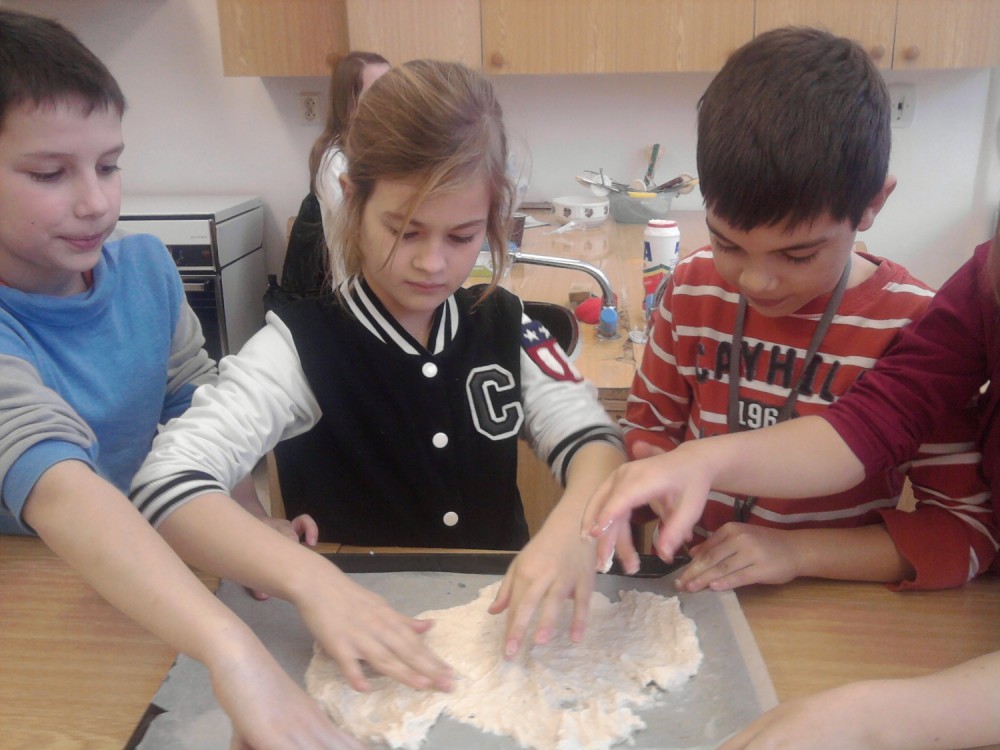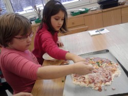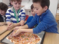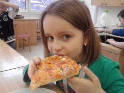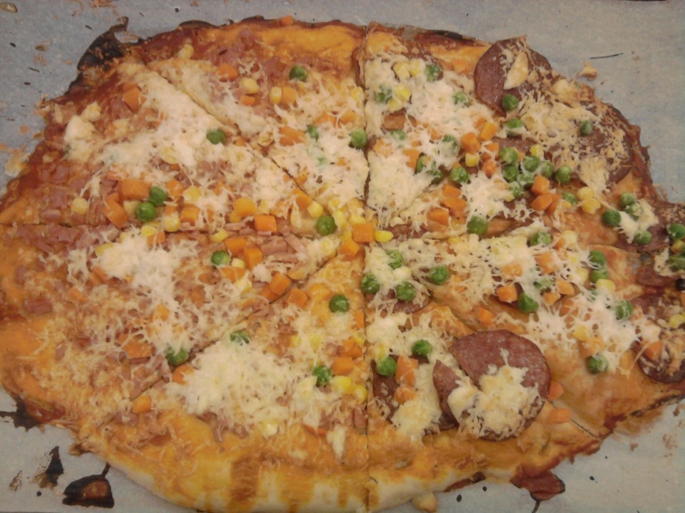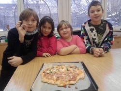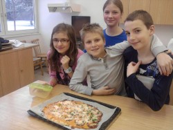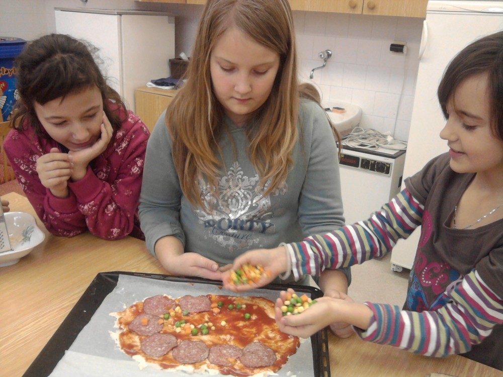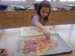 Dnes jsme s kuchaři pekli pizzu se saláme, šunkou, sýrem a zeleninou. Byla fakt výborná:)