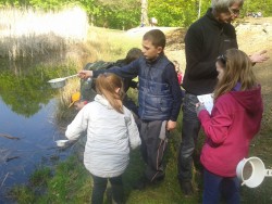 Šli jsme k rybníku, tam jsme se nasvačili. Pan učitel nám ukázal, jak máme lovit. A šli jsme lovit. Vzali jsme si sítka a misky. (Verunka Urbanová)