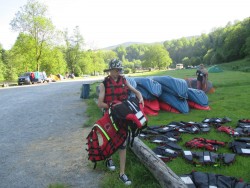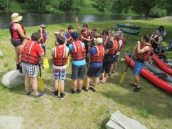 Po cestě autobusem, během které se nedočkavci každých pět minut ptali, kdy už tam budeme, jsme po asi pěti hodinách dorazili do Vyššího Brodu. Zde nejprve proběhla základní instruktáž nejen pádlování a pohybu ve vodě, ale i péče o lodě a další zapůjčené vybavení (vesty, pádla, ...) A po této instruktáži se konečně mohly nedočkavé posádky nalodit a vyrazit vstříc dobrodružství. A po absolvování prvních asi jedenácti kilometrů řeky jsme odpoledne dorazili do kempu Rožmberk, který se stal naším prvním dočasným domovem.
