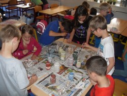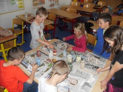 26. 5. 2015 Dokončení květnových výrobků - keramický šnek zdobený glazurou a burelem -stojan na tužky - glazovaní ptáčků z keramické hlíny - zdobená textilní taška, zažehlení 26 / 5 / 2015 KV
