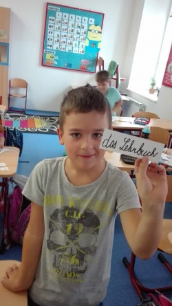 Tématem, které nás provázelo po celý den, byla "Škola". Slovíčka jsme měli předem přichystaná na dvou lístečcích se stejným obrázkem. Jeden lísteček byl však v jazyce německém a druhý lísteček s českým překladem jsme si museli podle obrázku hledat po třídě. Když jsme našli dva stejné lístečky, začal výtvarný kolotoč. Dostali jsme předtištěný obrázek, paní učitelka z něj větší část ustřihla a my museli zbytek libovolně dokreslovat. Práci nám zpříjemňoval poslech mluveného slova - pohádek bratří Grimmů.