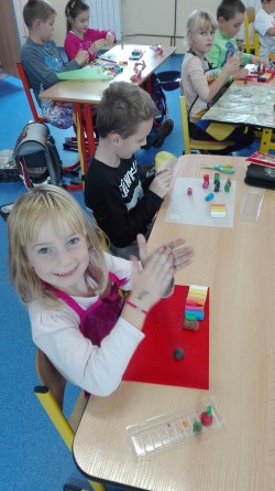 Blížíme se k polovině října a my už umíme několik písmen. Umíme je poznat v učebnicích, najdeme je na pracovních listech, bojujeme s jejich psaním. V jedné hodině pracovních činností jsme se rozhodli, že písmenka zkusíme také vymodelovat. Písmena A, L, M a E byla vymodelována za chvíli. Zabrousili jsme tedy společně i do prvouky a snažili jsme se vymodelovat i ovoce a zeleninu dozrávající na konci léta a na podzim. To už byl pro mnohé větší oříšek. Děti to ale nakonec vše zvládly a důkazem je naše "okenní výstava".
