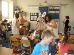 Dnes máme hodinu matematiku a v tom se najednou z ničeho nic ozve bouchání na dveře a rachocení řetězů, až se paní učitelka lekla... To nás přišli navštívit čerti, andělé a Mikuláš. A protože zlobivce by všechny neunesli, pořádně jim vyčinili alespoň za dveřmi. Andělům děti zazpívali a pověděli básničku, za což je Mikuláš odměnil malými dárečky.