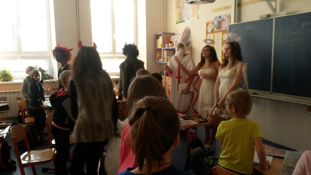 Dnes jsme přivítali v naší třídě Mikuláše s jeho družinou andělů a čertů. Mnohému z nás trochu zatrnulo, co kdyby...Někteří měli trošku namále, ale nakonec si čerti nikoho do pekla neodnesli a hodný Mikuláš nám nadělil balíček sladkostí.Třídu máme vyzdobenou čertíky , které jsme vyrobili v hodinách VV a PČ, tak se u nás čerti cítili jako doma.:-)