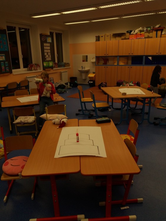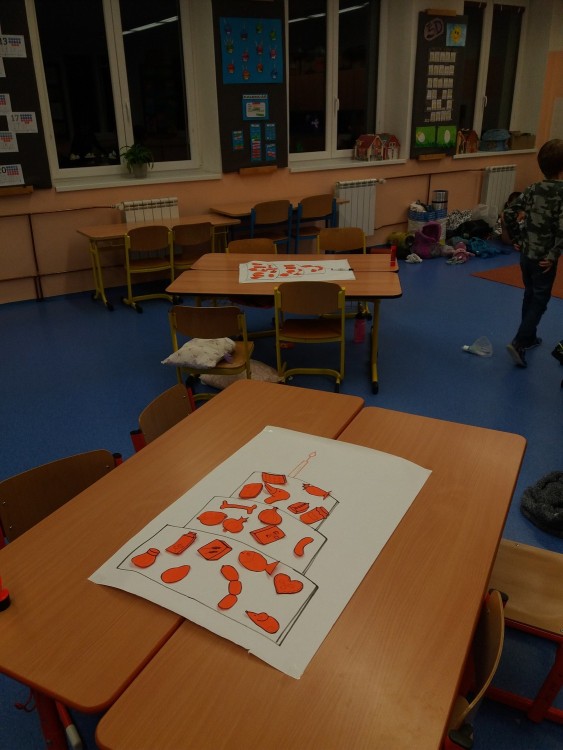 Jak si dělali k svátku dort - večerní hra, kde jsme po škole hledali suroviny, které pejsek a kočička dali do dortu a lepili je do dortu