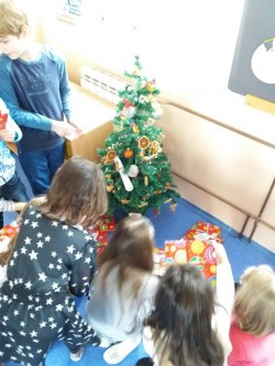 Vánoce jsou tady....všechny balíčky adventního kalendáře jsme rozbali a my se těšíme na Ježíška. Maminky nám napekly cukroví, které jsme ochutnávali. Zazpívali jsme si u vánočního stromečku koledy. Aby nám Ježíšek mohl dát dárky pod stromeček, šli jsme na procházku. Nejvíc nás zaujali zamrzlé kaluže. Po procházce jsme měli dárky již pod stromečkem. Každý si našel svůj dárek. A co jiného nám Ježíšek mohl přinést? Přeci knihu, abychom si vytvořili vlastní třídní knihovničku.
