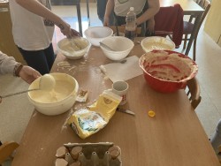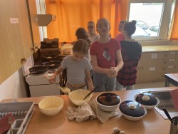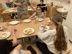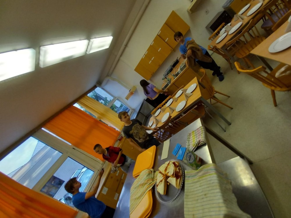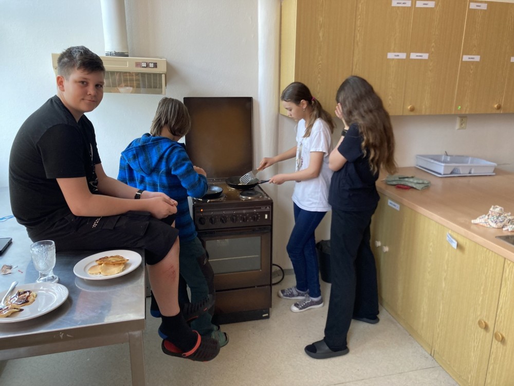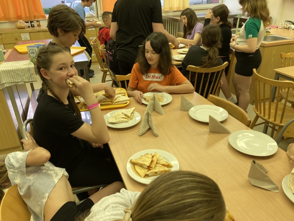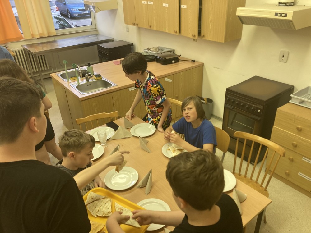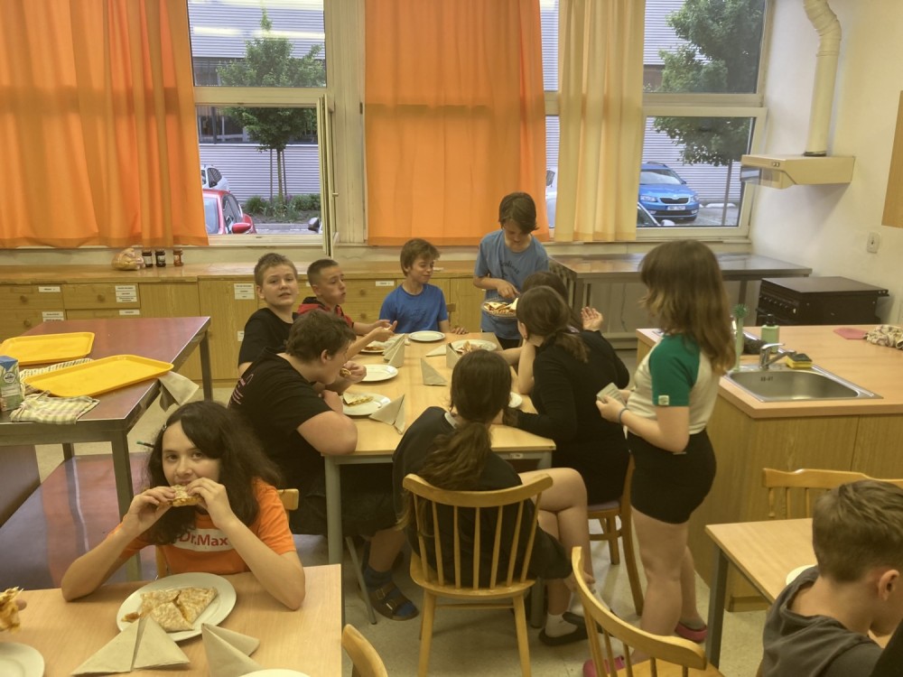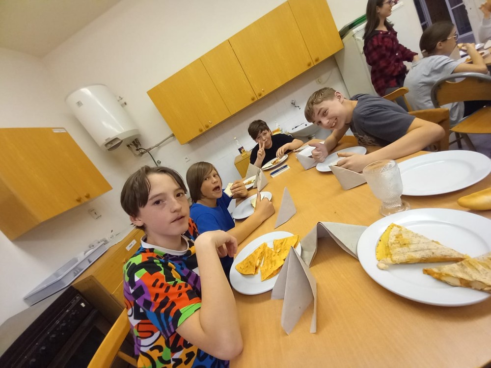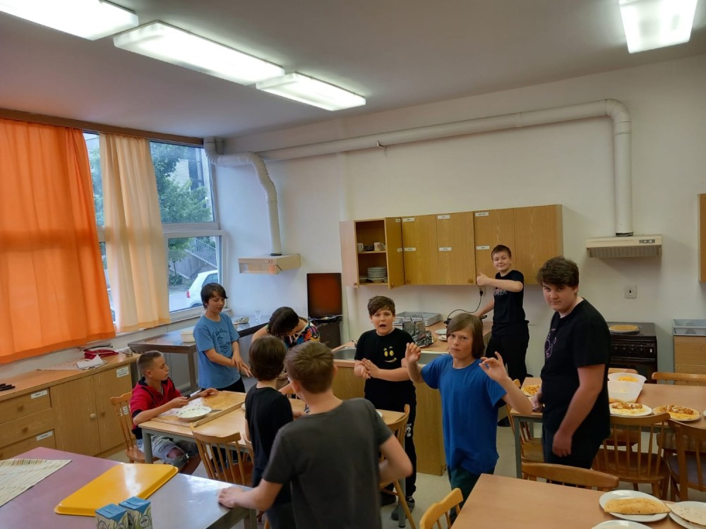 Žáci si vytvořili dvě výkonné skupiny pro zajištění stravování a využili prostor školní kuchyňky pro přípravu qurritos (večeře) pod vedením Seby M., následně si ráno přivstala dívčí skupinka Kamči I., která udělala všem lívance na snídani.