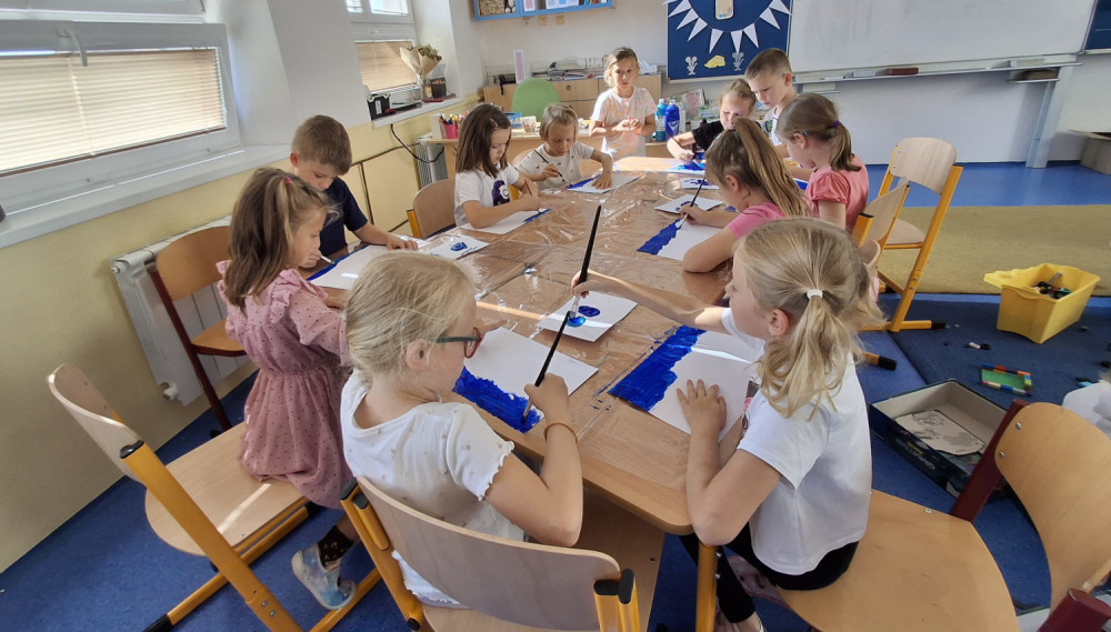 Společně malujeme krouživými pohyby moře. Procvičujeme si tak jemnou motoriku. Barevné rybky tvoříme přes  šablonu.