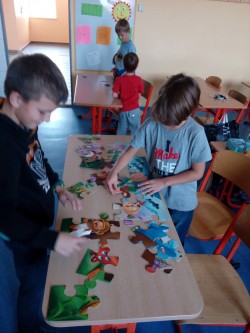 tvoření v odpolední družině malování na textilní pytlíky, puzzle, stavebnice dřevěné kostky