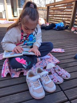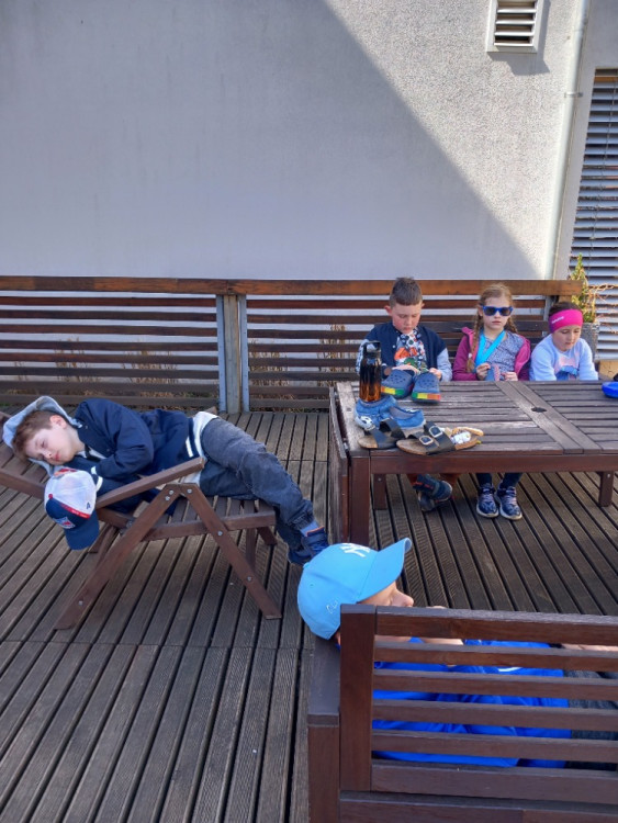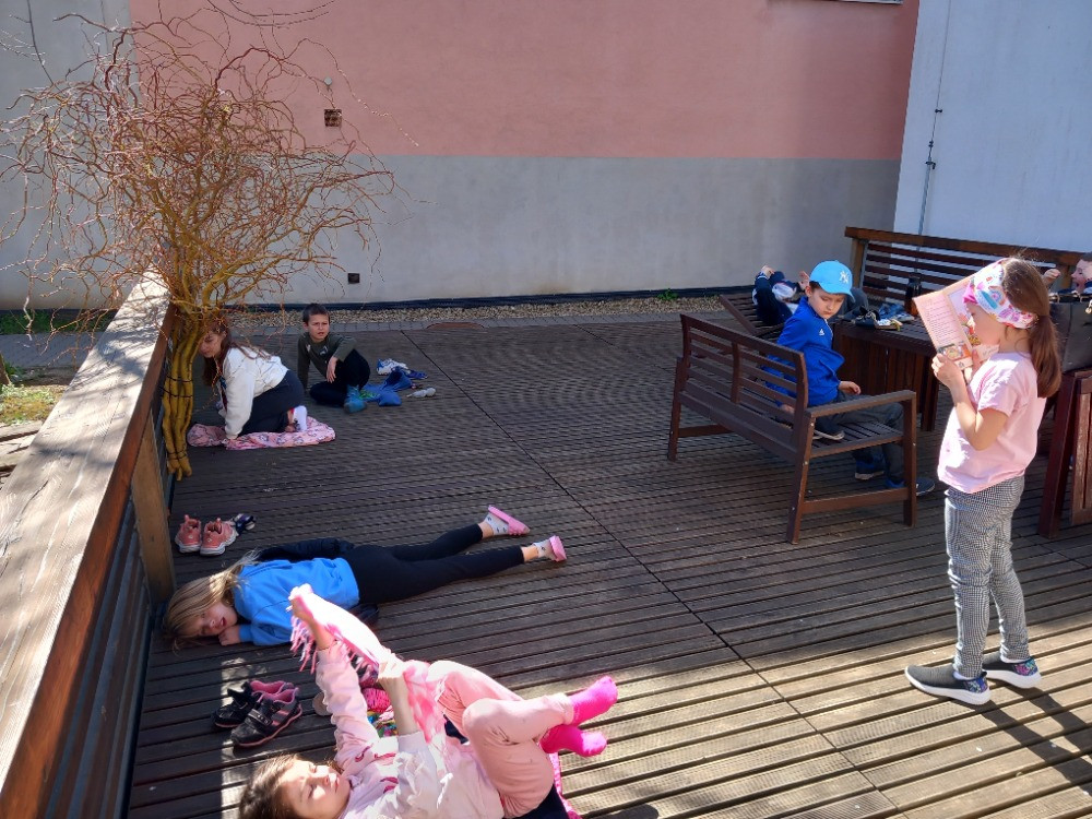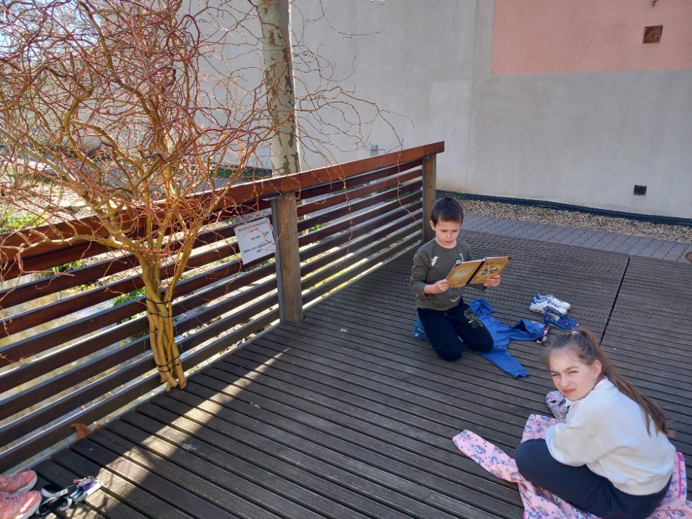 V rámci poobědového klidového režimu si čteme na terase u PBDS z knížky "Krysáci jsou zase spolu" a navazujeme tak ve čtení z loňského roku, kdy jsme si spolu s babičkou Jiřinkou četli z 1. dílu. Ve čtení se střídáme a docela nám to jde. Jedno odpoledne jsme pak navěsili na větve vrby a keřů naše ozdoby z barevných papírů, vlny a pěnovky, které se nám povedly.