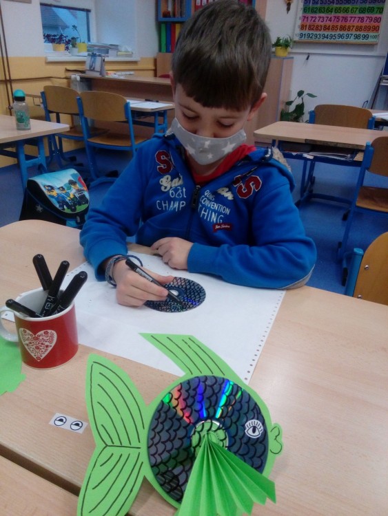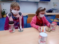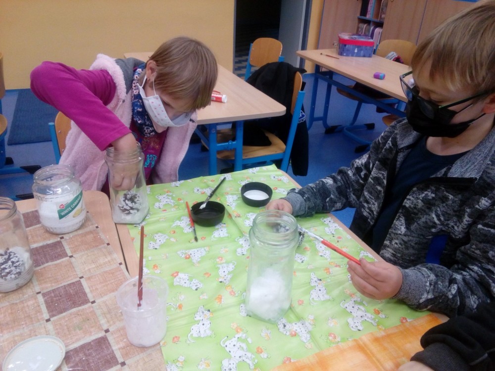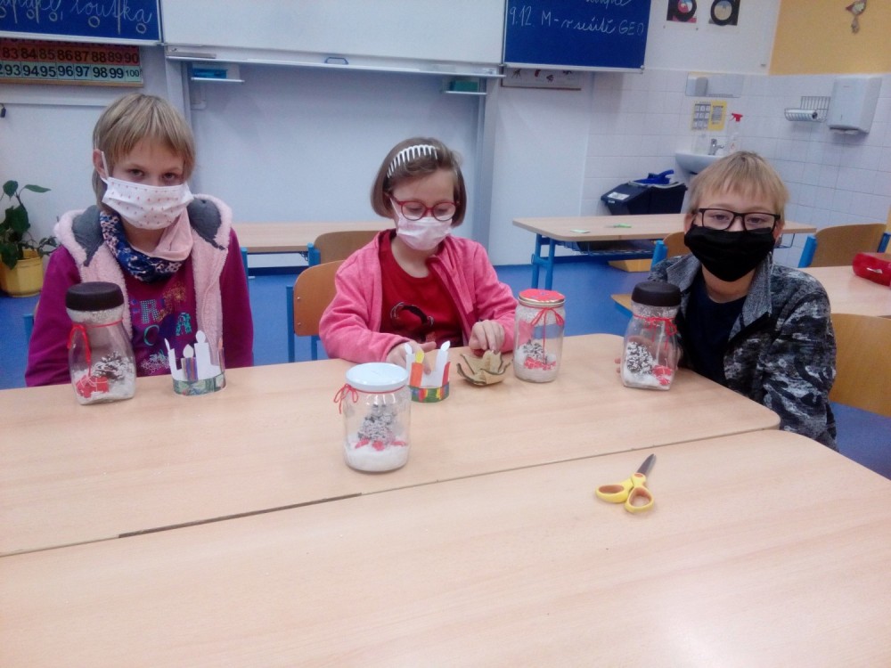 15. 12. 2020 Tvoříme ve školní družině dárečky pro rodiče - točíme svíčku z vosku ke keramické misce - zimní krajinka s dárečky ve skleněné sklenici - ryba z DC 15 / 12 / 2020 KV