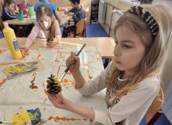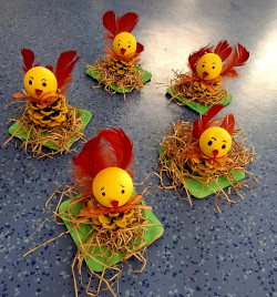 Hurá jarooo!🙂. Jarní kuřátko bylo tématem našeho společného tvoření. Žlutou temperovou barvou jsme natřeli šišku a polystyrenovou malou kouli, která se použila na hlavičku kuřátka. Obojí, včetně dalších doplňků jsem dětem slepila tavnou pistolí a kuřátko je na světě 🙂. Současně jsme se zapojili do tvoření vesmírné dekorace pro budoucí prvňáčky.