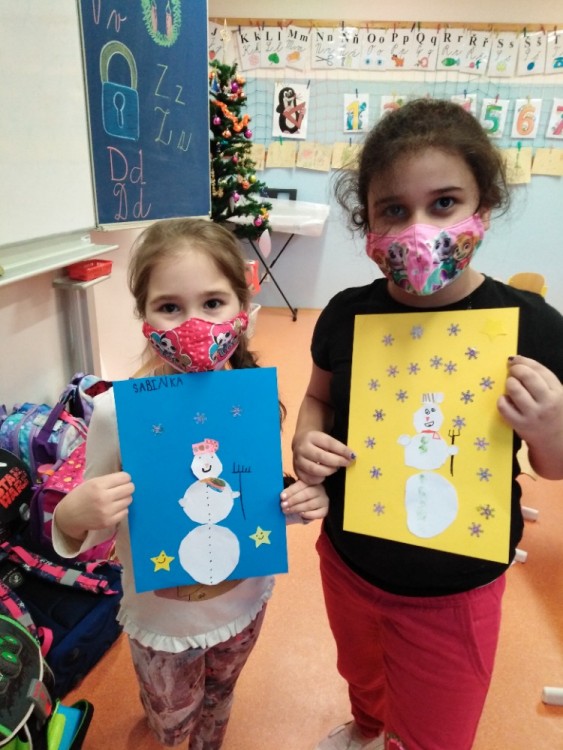 Než nám napadl sníh, namalovali jsme si na venkovní plakát sněhuláka.