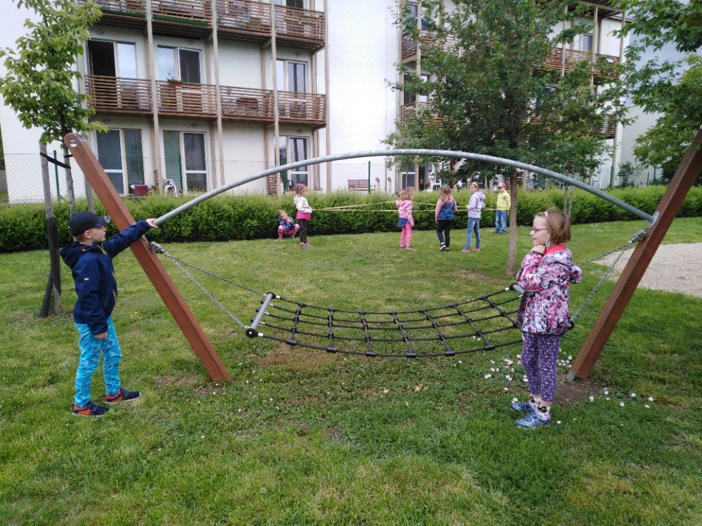 na zahradě školy, která se nám pěkně zazelenala. Skákali jsme přes gumu,