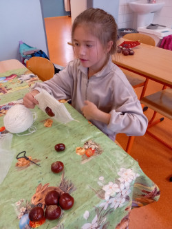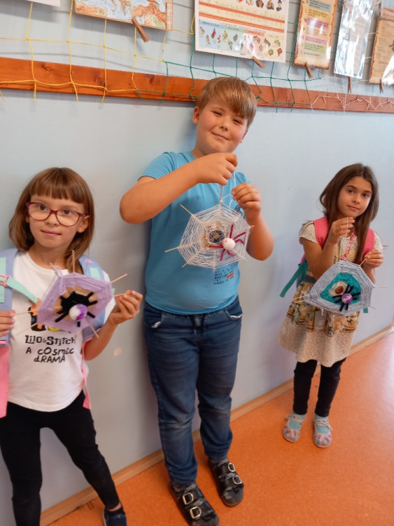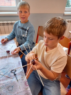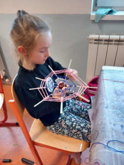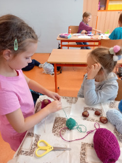 7. 10. 2024 Z nasbíraných kaštanů tvoříme krásné pavučiny. Učíme se bezpečně pracovat s vrtáčky. Vlnu trpělivě namotáváme na špejle. Někteří z nás si udělali i pár zvířátek. Práce nás moc baví, a tak v ní pokračujeme i další týden. 7 / 10 / 2024 BJ
