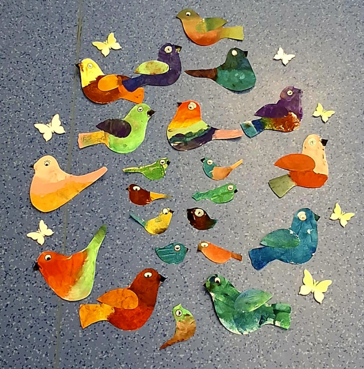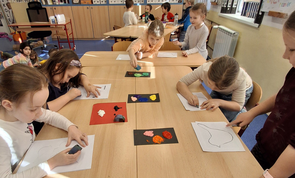 Ptáci patří mezi nejsnadněji pozorovatelné živočichy. Obecně můžeme rozdělit funkci zbarvení ptáků do dvou oblastí. Ochranná nebo sebeprezentační. My jsme si pro naše tvoření vybrali sebeprezentační ptáky, protože milujeme barvy🙂. Použili jsem předem připravenou šablonu ptáků a do ní jsme houbičkou tupkali různé odstíny temperových barev a nechali jsme volně pracovat naši fantazii. Pracujeme vždy ve skupince a postupně se ve tvoření střídáme. Baví nás také různé zábavné hry na koberci jako například Lego, vědomostní hry nebo skládání mozaiky🙂.Podívejte se do naší fotogalerie 🙂.