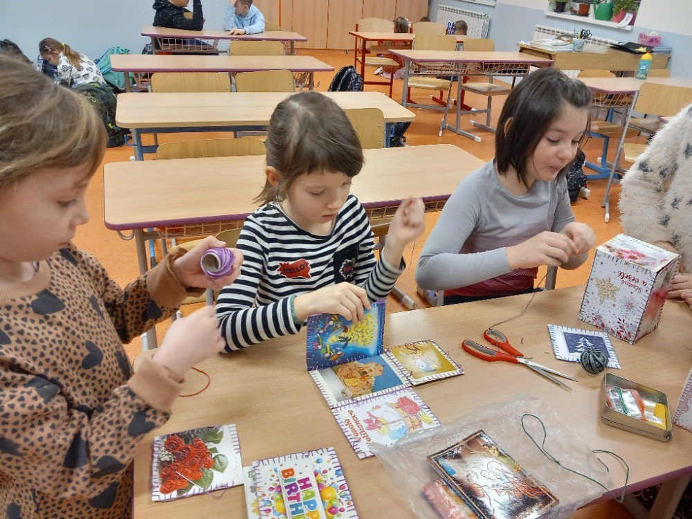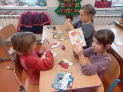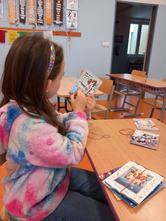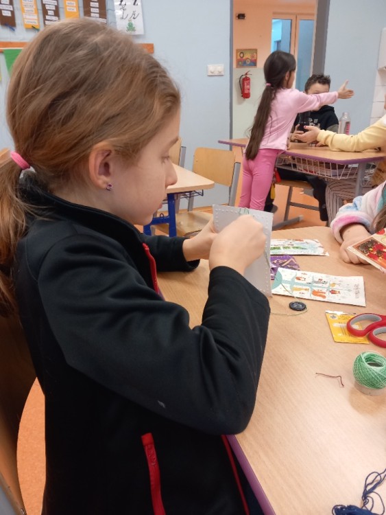 Poslední týden před svátky jsme se pustili do ručního šití krabiček z pohlednic. Naučili jsme navlékat niť, dělat uzlíky a šít ozdobným zahrádkovým stehem. V práci budeme pokračovat v novém roce, kdy budeme pohlednice k sobě sešívat. Ruční šití nás baví a těšíme se na další tvoření.