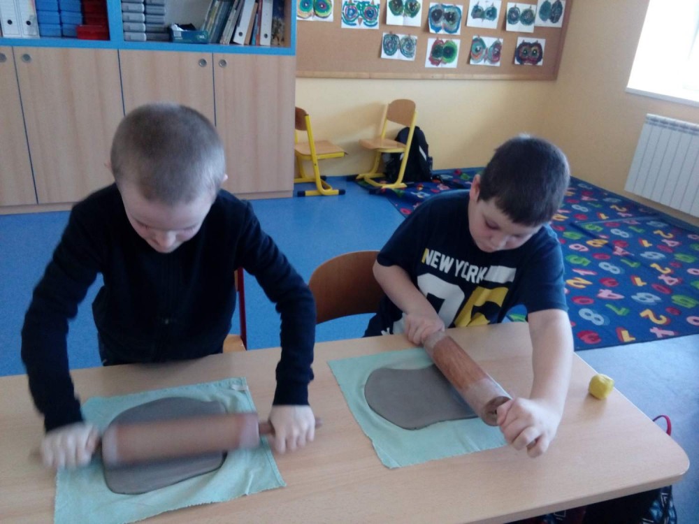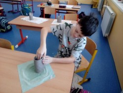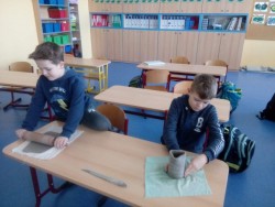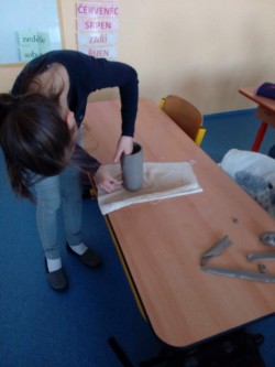 22. 2. 2019 2.oddělení - těší nás pěkné počasí, malujeme na chodník před školou - práce s keramickou hlínou, stojánek na tužky 23 / 2 / 2019 KV