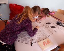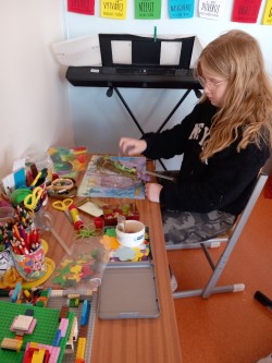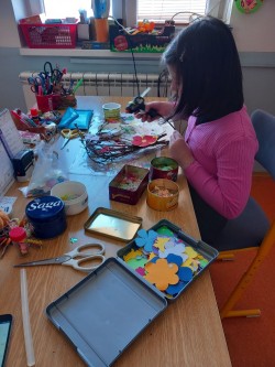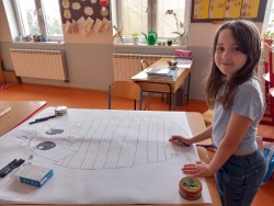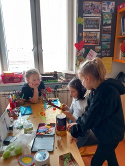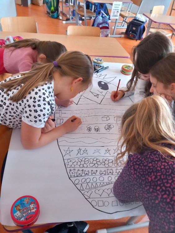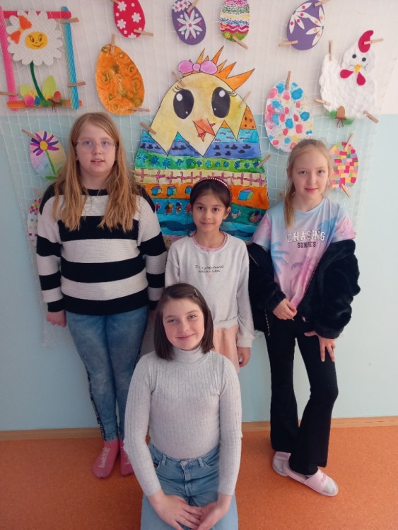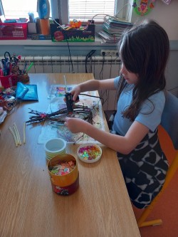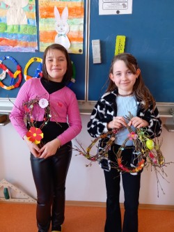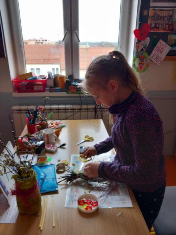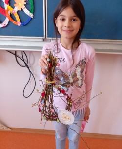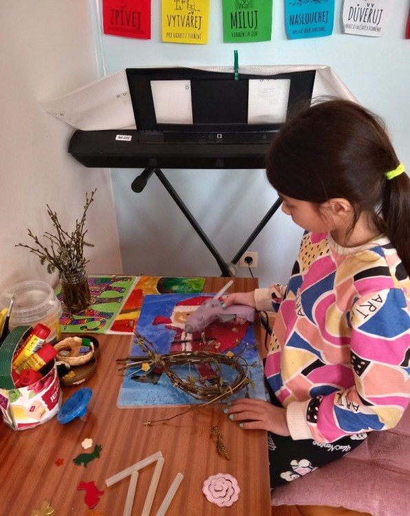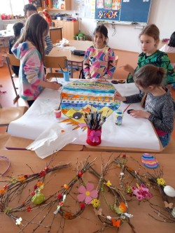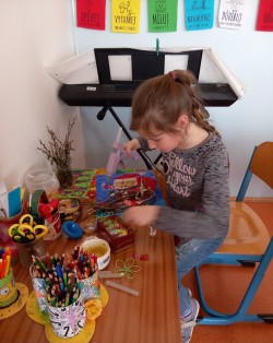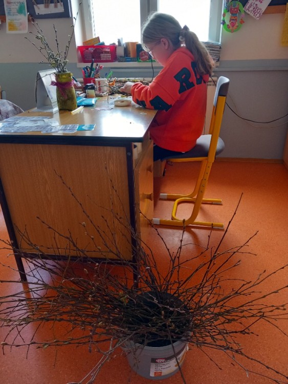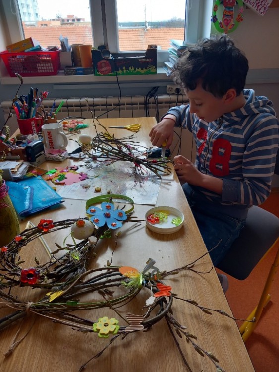 Pře Velikonocemi jsme si vyrobili dekorační závěsy z proutí, které bylo z prořezaných větviček z lesa. Pracovali jsme se dvěma tavícími pistolemi, což nás velmi baví. Nakreslili jsme si a namalovali další velikonoční plakát, tentokrát podle návrhu Amálky. Obě práce se nám moc povedly :-)