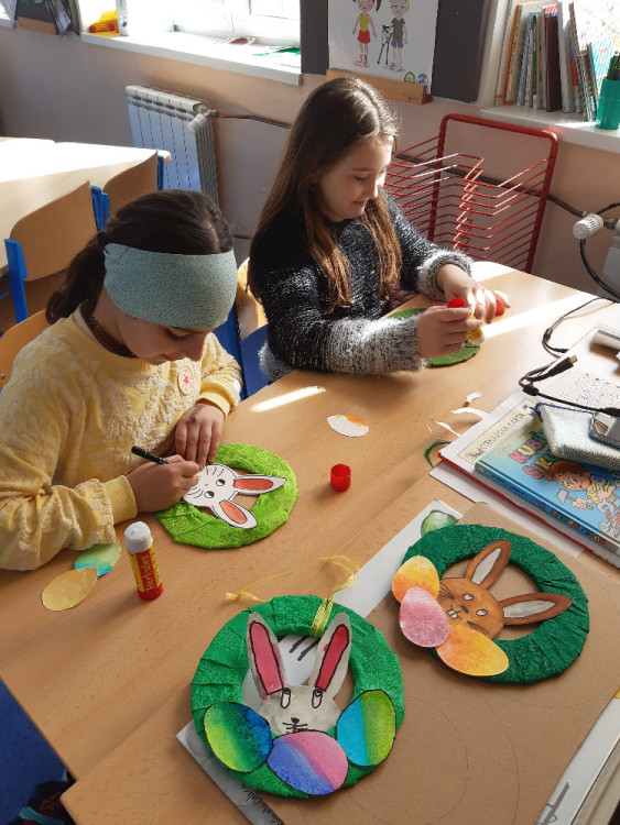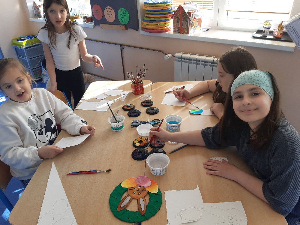 Před velikonočními svátky jsme si v družině vyrobili závěsnou ozdobu se zajíčkem a barevnými vajíčky. Žáci si vyzkoušeli zapouštění anilinových barev a použití soli na mokré barvy.