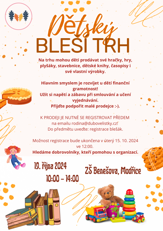 5. 10. 2024 DĚTSKÝ BLEŠÍ TRH 19.10. 2024 v 10:00 - 14:00 hodin ZŠ Benešova, Modřice kontakt: rodina@dubovelistky.cz 6 / 10 / 2024 KV