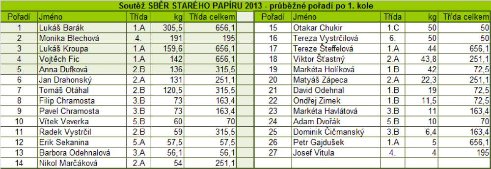 mohou zasoutěžit o pěkné ceny. Malá sladká odměna a uznání okolí nemine žádného sběrače. V prvním kole žáci shromáždili téměř dvě tuny starého papíru. To je skvělý výsledek! Moc je chválíme a průběžné pořadí vidíte v tabulce (když na ni kliknete, zvětší se).