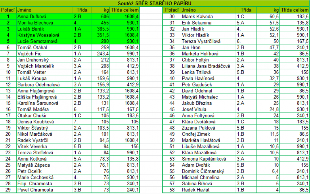 Představte si, že jste nasbíraly celkem 5.828 kg papíru a tím jste zachránily 116 stromků! To je ještě lepší než vloni. Ceny pro prvních pět nejlepších sběračů vám předáme v pondělí 3. června. Moc gratulujeme a chválíme Aničku Dufkovou (těch 506 kg je úžasný výkon!), Moničku Blechovou, Lukáška Baráka, Kristýnku Wossalovou, Lucinku Semotamovou, ale i všechny ostatní děti, které přinesly alespoň jeden balíček. Na obrázku (když na něj kliknete, tak se zvětší) je tabulka, kde můžete zjistit, kdo přinesl kolik kilo papíru. Moc vám všem děkujeme a vašim rodičům taky!