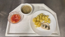 Příprava kuřecího závitku s bazalkovo-česnekovou náplní, aneb jeden z běžných dnů v naší školní kuchyni.