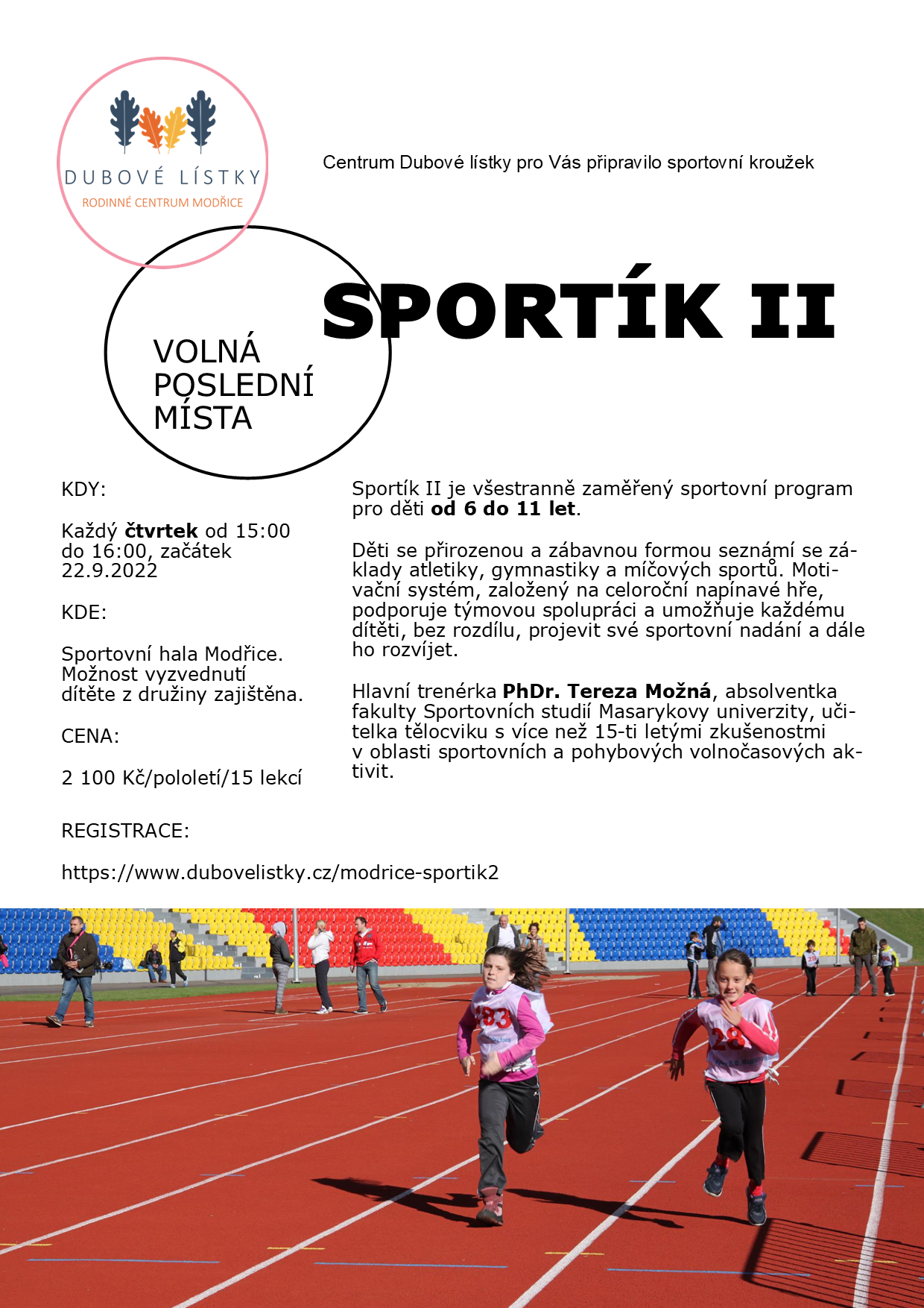 2021 / 2022 SPORTÍK II pro děti od 6 - 11 let KDY: čtvrtek od 15:00 - 16:00hod. - začínáme od 22.9. 2022 KDE: Sportovní hala Modřice cena 2100,- Kč 6 / 9 / 2022 KV