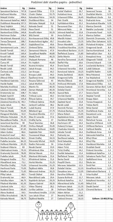 Absolutním vítězem podzimního kola se stala třída 3.B, která se kromě rekordního třítunového příspěvku mohla pochlubit i dvěma favoritkami soutěže – Barborkou Spoustovou a Moničkou Kačínovou, z nichž každá svou třídu podpořila přinesenými více než sedmi sty kilogramy starého papíru!
