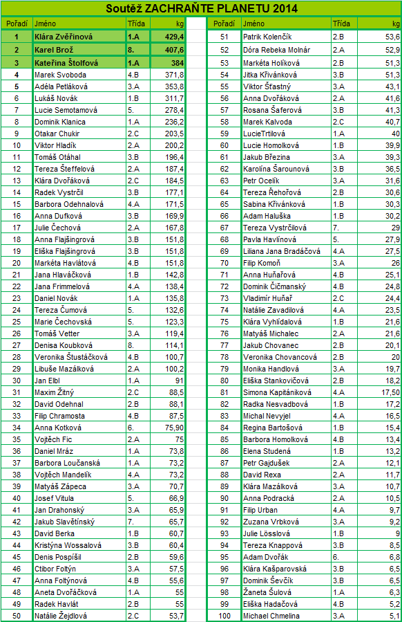 Gratulujeme vítězům, ale všechny Vás moc chválíme. Celkově jste nasbírali 8.641,4 kilogramu papíru a zachránili tak 172 stromků před pokácením. Kdybychom sečetli, kolik stromů už jsme v průběhu soutěží ve sběru papíru zachránili, asi by to byl pořádný kus lesa. Dobrá práce!